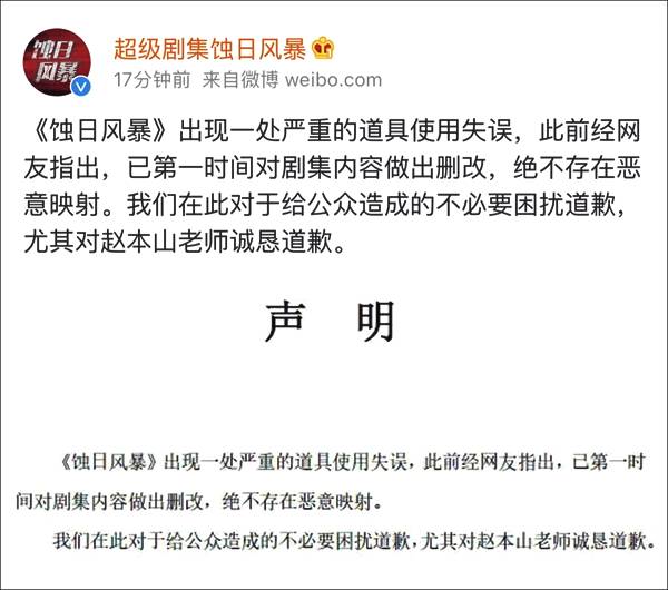 随后,《蚀日风暴》剧组在微博发布声明,向赵本山致歉。 声明称,《蚀日风暴》出现一处严重的道具使用失误,此前经网友指出,已第一时间对剧集内容做出删改,绝不存在恶意映射。在此对于给公众造成的不必要困扰道歉,尤其对赵本山老师诚恳道歉。 截至发稿,赵本山未对此事作出回应。